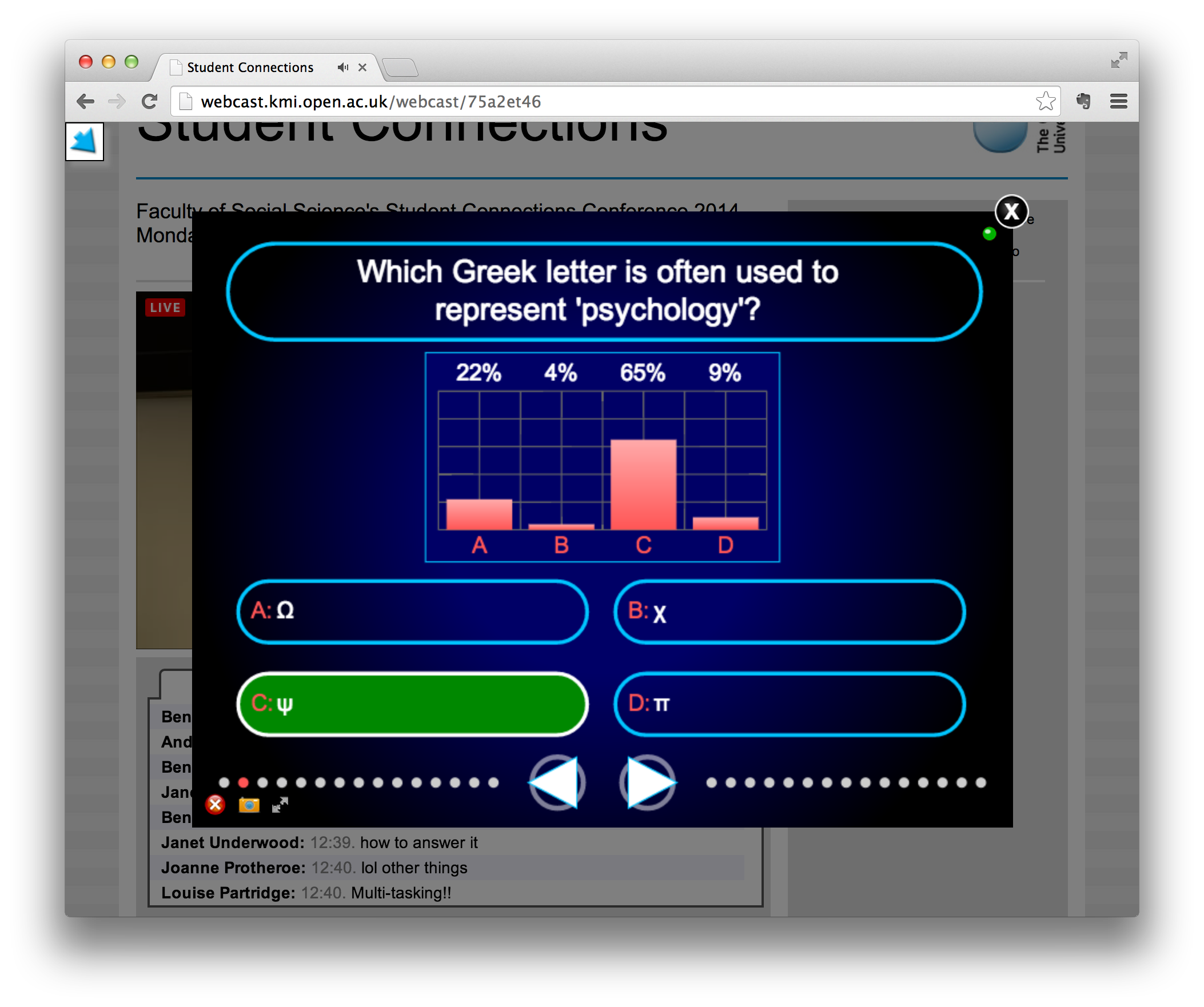 KMi hosted the first Student Connections conference this week. The online event from The Open University’s Faculty of Social Sciences took place between 30 June 2014 – 4 July 2014 and presented a series of highly interactive webcasts to Open University students from all the Faculty.