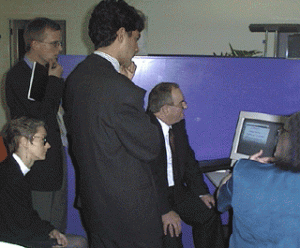 Over a two hour working lunch in the KMi, Mr Brown met with Prof Marc Eisenstadt and received presentations from Peter Scott (KMi), Ches Lincoln (Technology) and Gilly Salmon (OUBS). Ches illustrated how the OU supports students communication using conferencing systems like the FirstClass Internet Client. She showed how this is in regular use by thousands of students, their tutors and counsellors. Gilly illustrated the work of the OU Business School including the recent developments in the Business Cafe. Peter demonstrated the new technologies which KMi is harnessing and shaping to support the students and staff of the OU, including the KMi Stadium project.