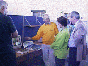 The photo shows, left to right, Dr. Peter Whalley (MET group), Dr. Dave Williams (Earth Sciences), Nina and Dr. Monro looking at a custom interface for an Apple Pippin low-cost computer running a QTVR/Director virtual tour of Walton Church.