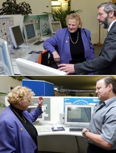 Photo shows Peter Sharpe (top) demonstrating KMi Stadium and Heronsgate school video projects and Colin Barrett (bottom) introducing CABERs digital media archive.