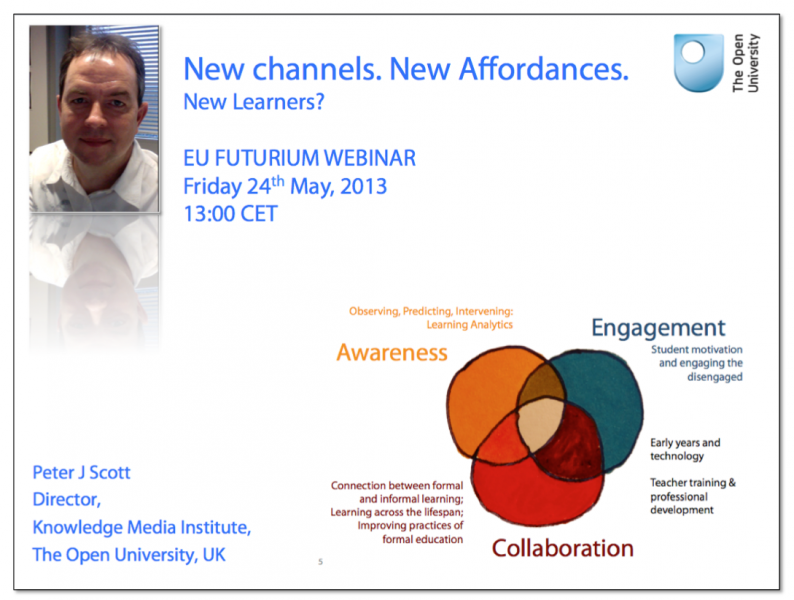 The live Webinar was hosted under the Digital Agenda for Europe events aimed to discuss policy innovation with a long term vision. Professor Scott led a discussion on "New channels. New affordances. New learners?" which picked up on foresight thinking from EU projects like STELLAR and TELMAP. This work aims to help us to see the emerging shape of a new learning landscape, and to put innovations like Learning Analytics and MOOCs into the wider context.