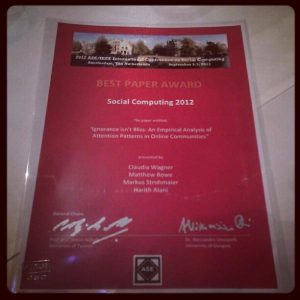 And the best paper award of the ASE/IEEE International Conference on Social Computing goes to …….