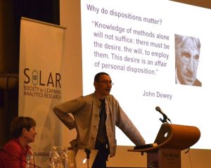 * EDUCATIONAL DATA MINING = LEARNING ANALYTICS? I hosted a panel debate in which we invited panellists from the longer established EDM community, to explore with panellists from LAK, the nature of the EDM-LAK relationship. This turned into an interesting debate, conducted in very polite terms (mostly!), which seemed to confirm that EDM researchers contribute expertise in designing and improving data mining algorithms and large, fine-grained data sets (often from intelligent tutoring systems), from which some LAK researchers could certainly benefit. However, LAK is also concerned with other forms of analytic (e.g. social networks; discourse; dispositions), and has a priority to bring in the wider constituency of stakeholders who form the ecosystem around analytics, from learners and educators, to administrators to policymakers at institutional, regional and national levels. This seems to me very appropriate, since data and analytics platforms (in general) do not exist in a vacuum, but always within intellectually, economically and politically charged contexts.