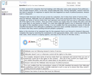 Paul showed me the introductory tutorial on argument mapping in the OU’s Moodle-based VLE (using the OU’s OpenMark formative assessment technology), and the integrated drag+drop interface for students to complete simple argument map templates, in their analysis of a target text. The screens show how the learner drags the statements into the template in order to demonstrate their ability to parse the text into the top level claim, and supporting/challenging premises/sub-premises. Learners can then check their map, which preserves the elements in the correct place, but leaving them to try again with those they got wrong.