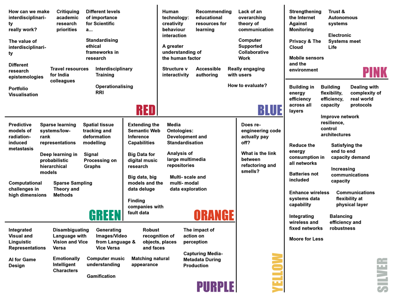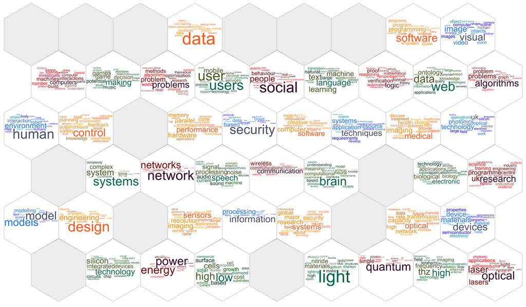 One interesting aspect of this workshop was that it did not involve the conventional jotting down of challenges on post-it notes followed by a manual collaborative clustering on a large wall space. Instead, each network submitted beforehand three challenges in form of a title and 50-word abstract, which were projected automatically onto a self-organised hexagon map of keywords that came out of an automated algorithm (Latent Dirichlet Allocation) from existing abstracts of the Grants on the Web on EPSRC’s website. These topic maps were created prior to the meeting with tools from http://www.researchperspectives.org. According to EPSRC staff, they provide a different, alternative overview of the current EPSRC Grant portfolio but – as was stressed repeatedly – by no means the only one for EPSRC.