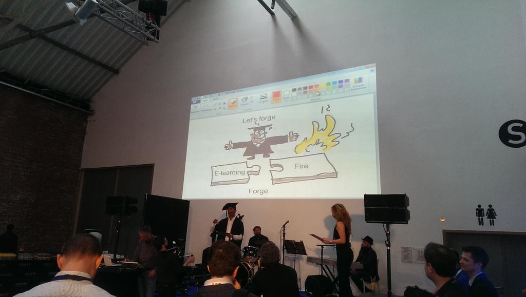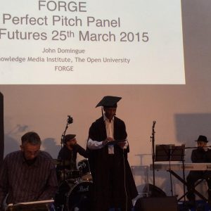 One of the highlights of the conference was the Perfect Pitch Panel where eight projects each selected by the head of their home unit competed against each other in terms of market readiness and take-up and overall economic and societal impact. Within this session John Domingue gave a live demo of the FORGE iBook including the on-the-fly creation of a simulated internet on a shared area running on a KMi server and setting up and running internet experiments on iMinds w-iLab.t test facility running in Ghent. The first demo is part of a collaboration between KMi and Cisco where we are extending their Packet Tracer software which is used to train over 1 million network engineers globally each year. To keep the crowd entertained (the event ran from 5-7pm) a live band played during the breaks and a live cartoonist was employed (see figure). We were very happy to have been officially awarded the ‘Hottest Pitch’ prize which was presented by Mario Campolargo, the Net Futures Director.