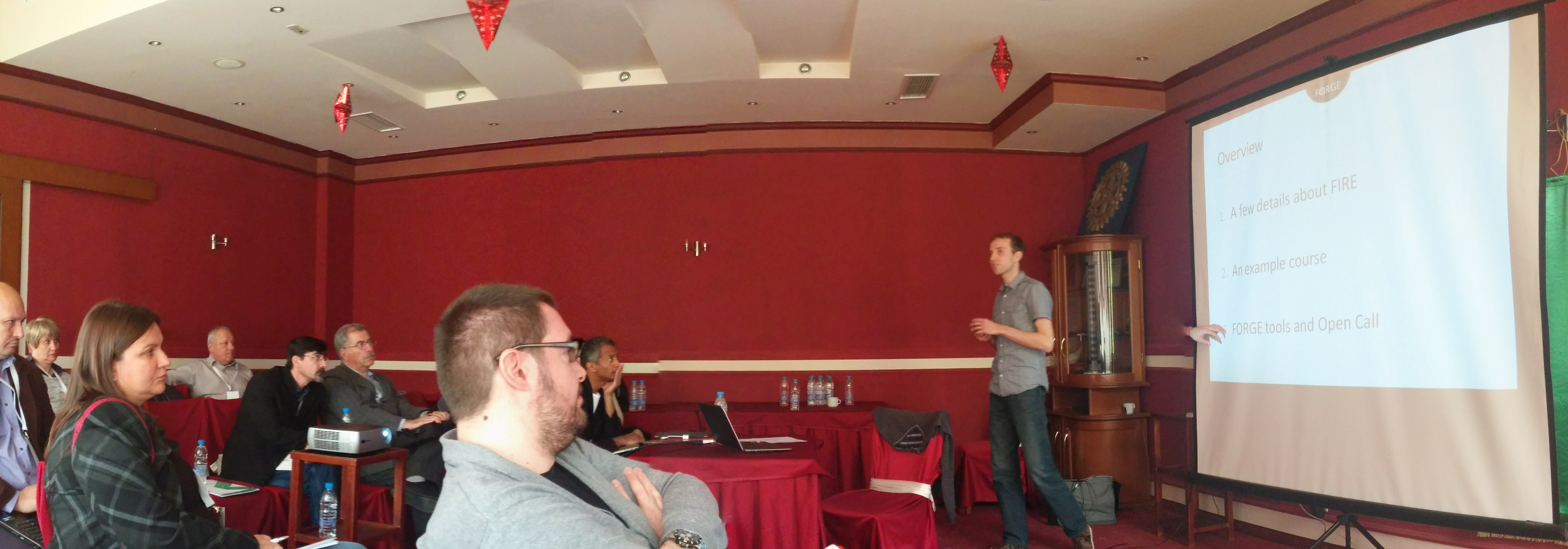 This presentation was complemented by a hands-on session where more technical insights about both the project and its Open Call were presented. First, Daan Pareit (iMinds, Ghent University) presented some sample FIRE experiment facilities and their typical lifecycle. Afterwards, he showed how to use FORGE’s tools to operate a sample testbed. Finally, Alexander Mikroyannidis guided the audience on how to produce an iBook which contains FORGE’s resources.