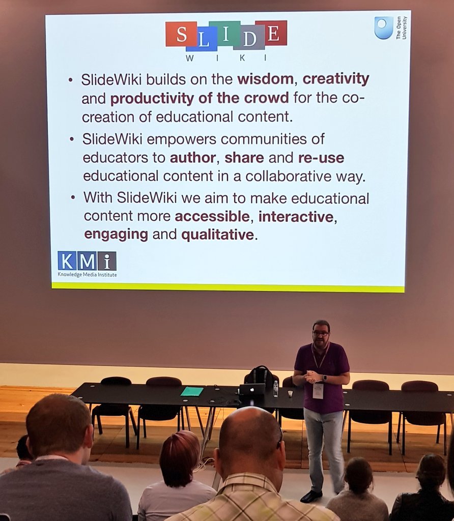 Alexander’s workshop introduced participants to the SlideWiki platform and its functionalities for collaborative authoring of Open Educational Resources (OERs). Participants were also introduced to the latest technological developments behind SlideWiki, regarding its integration with different educational platforms. Additionally, participants have had the opportunity to try the SlideWiki platform and perform a range of OER-related tasks, including finding OERs, reusing existing OERs, as well as authoring new OERs in collaboration with other participants. Participants were able to offer their feedback via discussions and complete a questionnaire evaluating SlideWiki in terms of its usefulness and usability.