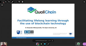On 26 May 2021, Alexander Mikroyannidis (The Open University, UK) delivered the webinar Facilitating lifelong learning through the use of blockchain technology as part of the CPD webinar series of the Association for Learning Technology (ALT). In this webinar, Alexander presented the QualiChain project and the lifelong learning pilot that he is leading. This pilot aims at supporting lifelong learning through the use of Blockchain technology. In particular, this pilot uses Blockchain technology in order to provide lifelong learners with transparent and immutable educational accreditation in the form of Smart Blockchain Badges. Additionally, within this pilot lifelong learners are provided with personalised recommendations that help them reach their personal and professional learning goals. The slides of this webinar are available here.