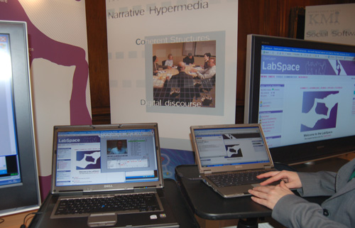 KMi will be represented by Simon Buckingham Shum, Peter Scott, Marc Eisenstadt, Alex Little, Michelle Bachler, Elia Tomadiki, Ale Okada, all in place to enthuse about and demonstrate the three technologies that form a key component of the LabSpace environment: Compendium, FlashMeeting, and MSG.