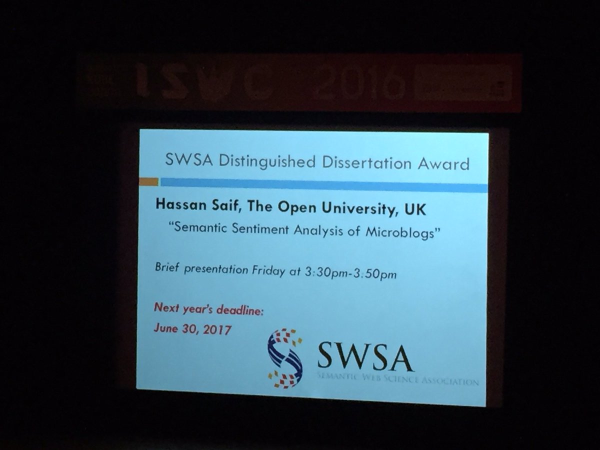 However, the highlight was probably Hassan Saif winning the highly prestigious SWSA Distinguished Dissertation prize, awarded every year to the best Doctoral Thesis in the field. As the winner of this prize, Hassan gave an invited talk about his doctoral thesis, "Semantic Sentiment Analysis of Microblogs".