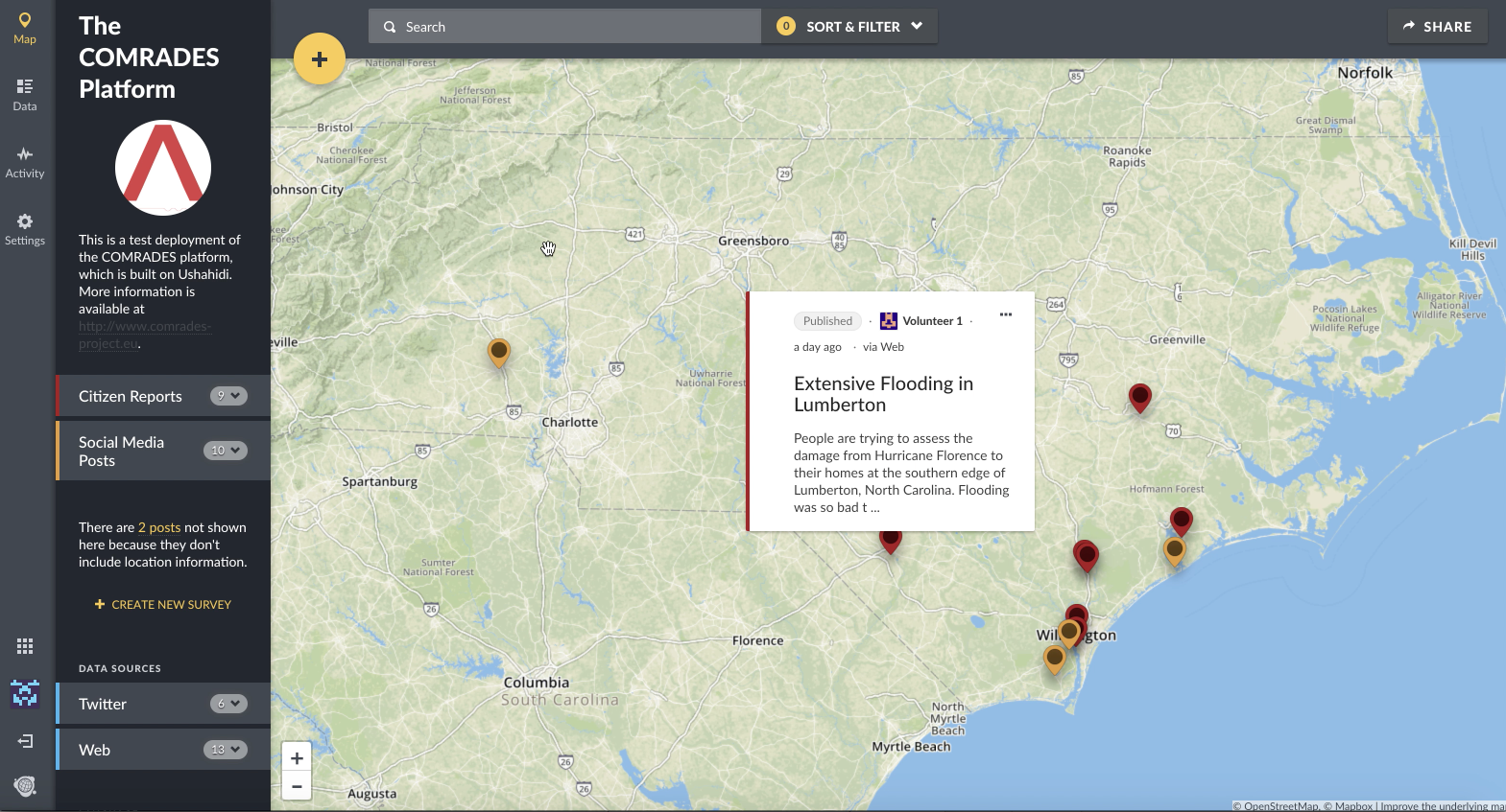 - Ushahidi COMRADES platform: allows the gathering of information, incidents, and reports from people directly or via Twitter. The primary source code for the functionality of the platform is available on Github. Also available is the source code that fetches data from the services developed for COMRADES, such as YODIE, CREES, and EMINA.