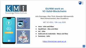 On July 13th 2020, the work of the Open Blockchain group was presented to the W3C Credentials Community Group. John Domingue, Allan Third, Alexander Mikroyannidis, Niaz Chowdhury and Mano Ramachandran joined a conference call between all members of the W3C group and presented their latest work on Verifiable Credentials and Blockchains. In particular, John and Allan presented the Open Blockchain architecture and its applications on the Institute of Coding project. Alexander presented an overview of the QualiChain project, its scope and objectives, as well as the pilot conducted by the Open University on lifelong learning. Niaz and Mano presented a Blockchain-based COVID-19 digital immunity passport. The slides from this presentation are available here.