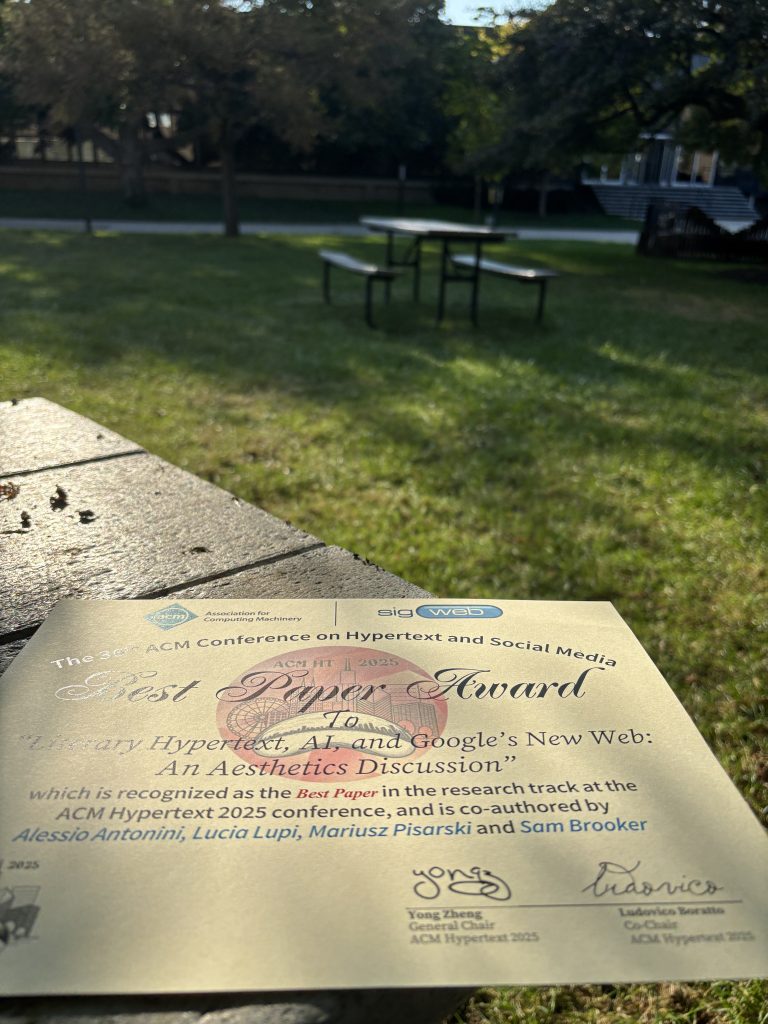 KMi is delighted to announce that the paper “Literary Hypertext, AI and Google’s New Web: an Aesthetic Discussion”, by Alessio Antonini, Lucia Lupi, Mariusz Pisarski and Sam Brooker, received the Best Paper Award at this year’s ACM Hypertext conference in Chicago.