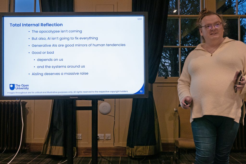 John and Aisling provided an overview of AI’s evolution, from its origins to its contemporary applications in areas such as automotive technology, social media, and mapping services. They delved into topics such as knowledge representation and the fundamentals of ChatGPT, with a particular emphasis on neural networks. They additionally showcased examples like the OU’s AI Digital Assistant for student support and AI applications in image and video generation. Furthermore, they explored both the optimistic and pessimistic aspects of AI, engaging in discussions surrounding ethics, copyright issues, legal considerations, and potential misuse.