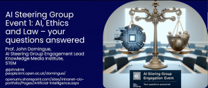The OU’s newly created AI Steering Group recently ran its first official event titled “AI, Ethics and Law – your questions answered” which was very successful with 315 attendees and 200 questions submitted. The event had three main parts and was supported by two KMi staff.