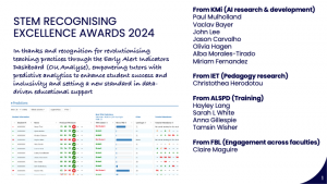 We are thrilled to announce that a team of researchers, technology developers, pedagogical experts and tutors from KMi and The Open University have been awarded the prestigious 2024 STEM Recognising Excellence Award for their groundbreaking contributions to education. Their work, particularly the development and successful implementation of the Early Alert Indicators Dashboard (OUAnalyse), has transformed how tutors support students by leveraging predictive analytics.