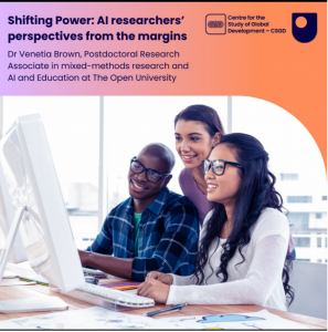 On Tuesday 5th November, Dr Venetia Brown from the Shifting Power team gave a seminar presenting her research to the Centre for the Study of Global Development, a multidisciplinary centre within the Faculty of Wellbeing Education and Language Studies at The Open University. 105 people registered for the hybrid presentation, which examined a key theme: “How AI researchers and practitioners from low- and middle-income countries and marginalised researchers in higher-income countries conceptualise AI’s societal and cultural harms“. It explored the question, “What does the technology mean to these stakeholders?” while prompting the audience to consider its implications for those in the Global North, who have the resources and wealth to research, develop, deploy, and benefit from it.